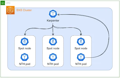 Karpenter will be constantly monitoring the cluster for any need for nodes. When there is a shortage of nodes, it spins up the spot node for us. When a spot interruption happens, NTH will identify the same from the instance metadata and will start draining the node. Upon draining the nodes, the pod will go into a pending state and Karpenter will get notified. Hooyah! We have a new node in place. We kept the EKS node group with only 2 nodes which was tainted to accommodate only the critical workloads, including the addons.