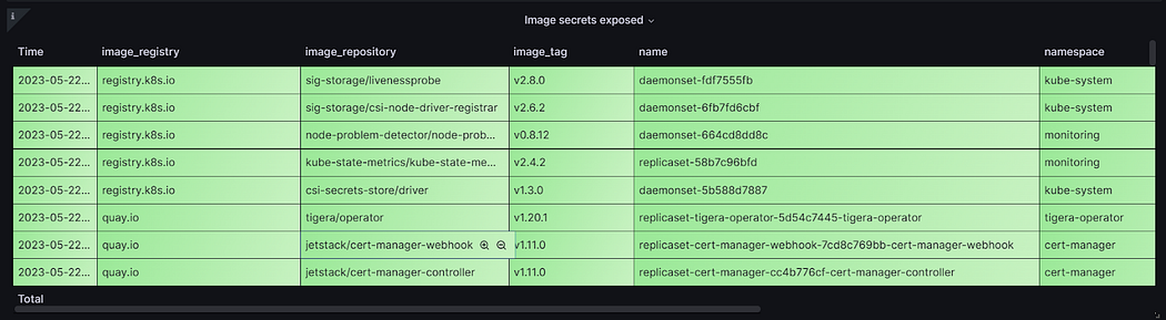 We first integrated each tool into Grafana using Grafana Agent as the data source. Then, we created panels in Grafana to display real-time security alerts, compliance status, and vulnerability scan results. We utilized Grafana’s interactive filters and drill-down capabilities to enable users to narrow down the view based on specific criteria such as time ranges, namespaces, or clusters.