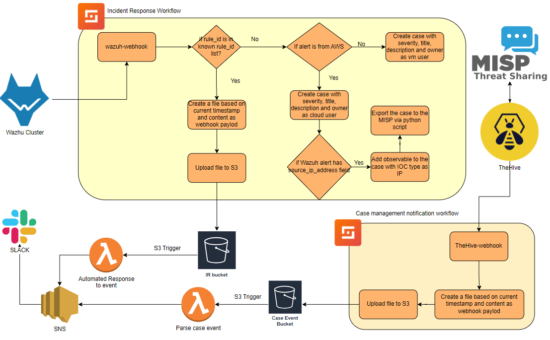 This workflow is designed to automate the response to alerts generated by Wazuh either by creating cases or triggering incident response automation workflows.