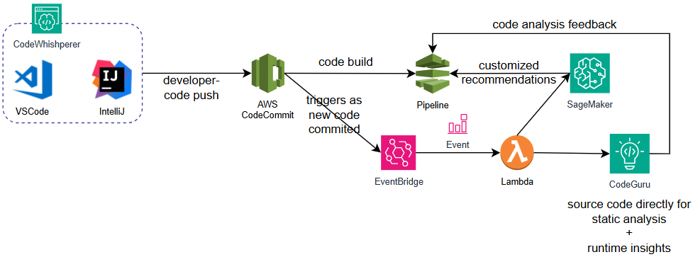 Amazon CodeWhisperer, SageMaker, AWS Lambda, Amazon CodeGuru, Amazon CloudWatch